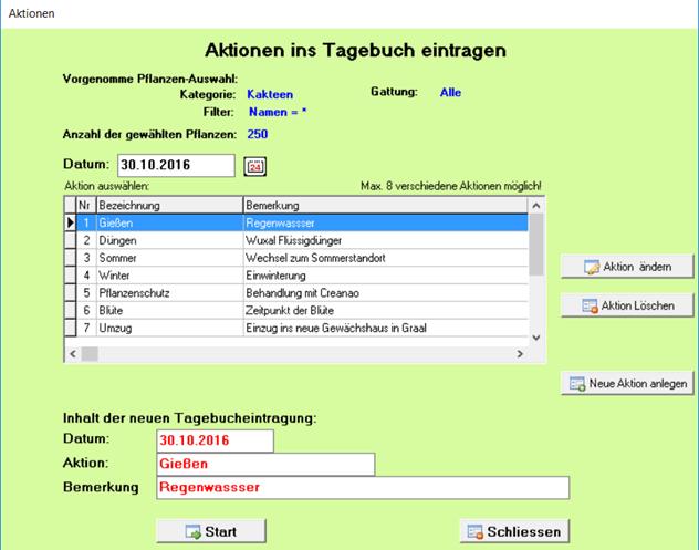 Aktionen können für beliebig viele und nach beliebiger Auswahl für die Pflanzen ins Tagebuch eingetragen werden. Die Eintragung führt die Software selbstständig aus. Genutzt wird diese Funktion um, wie oben zu sehen, Aktionen die für viele Pflanzen gleichzeitig ausgeführt werden im Tagebuch zu archivieren. z.B. Giessen, Düngen, Standortwechsel usw. |
